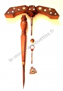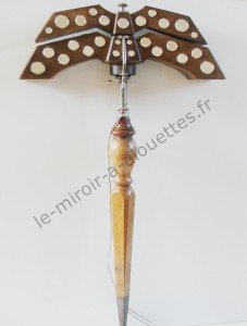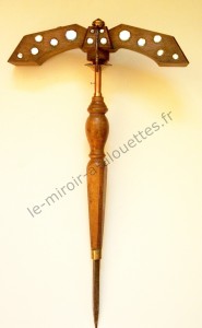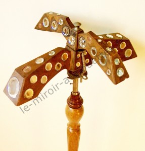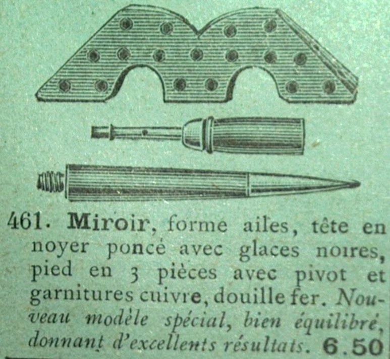 Ce miroir aux facettes noires est une curiosité rare, absente des autres catalogues de vente par correspondance de l'époque. Les glaces sont cerclées de bois grâce à une fraise spécifique qui creuse un sillon circulaire (onglet décalé), apportant une esthétique supérieure à l'objet.